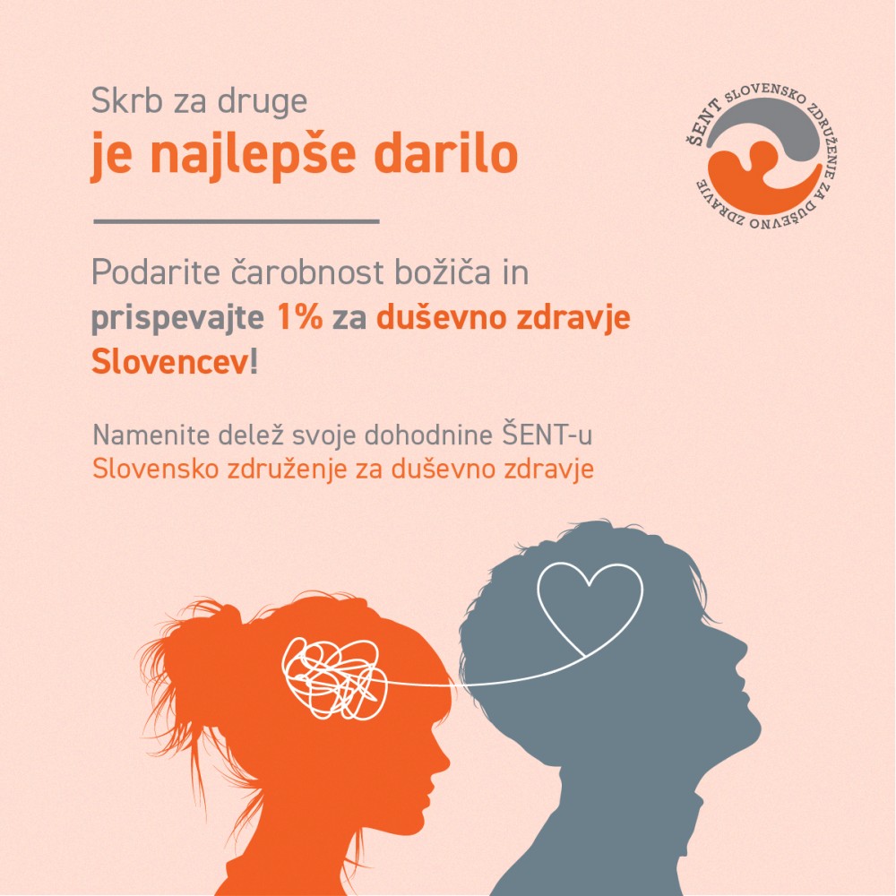 Z namenom 1 % dohodnine ŠENT-u – Slovenskemu združenju za duševno zdravje pomagate ljudem, ki se soočajo z duševnimi stiskami, da dobijo podporo, posluh in prostor, kjer so sprejeti takšni, kot so. Vaš prispevek ne pomeni dodatnega stroška, lahko pa nekomu prinese občutek varnosti, upanja in topline.