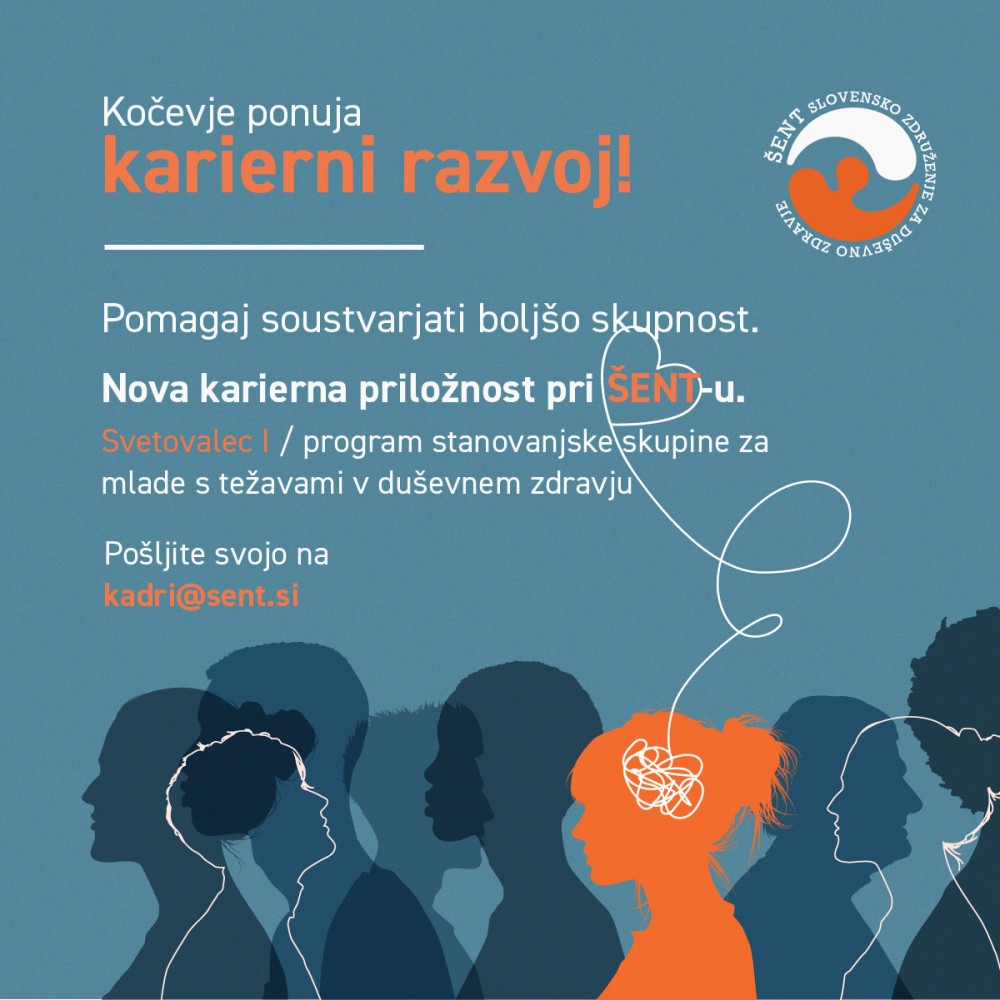 V ŠENT širimo strokovno ekipo in vabimo kandidata oziroma kandidatko za delovno mesto SVETOVALEC I V PROGRAMU STANOVANJSKE SKUPINE ZA MLADE S TEŽAVAMI V DUŠEVNEM ZDRAVJU (M/Ž) v Kočevju. Iščemo osebo, ki bo s strokovnostjo, izkušnjami in predanostjo podpirala mlade uporabnike pri vsakodnevnem življenju, spodbujala razvoj socialnih veščin ter sodelovala pri individualnih in skupinskih programih podpore.